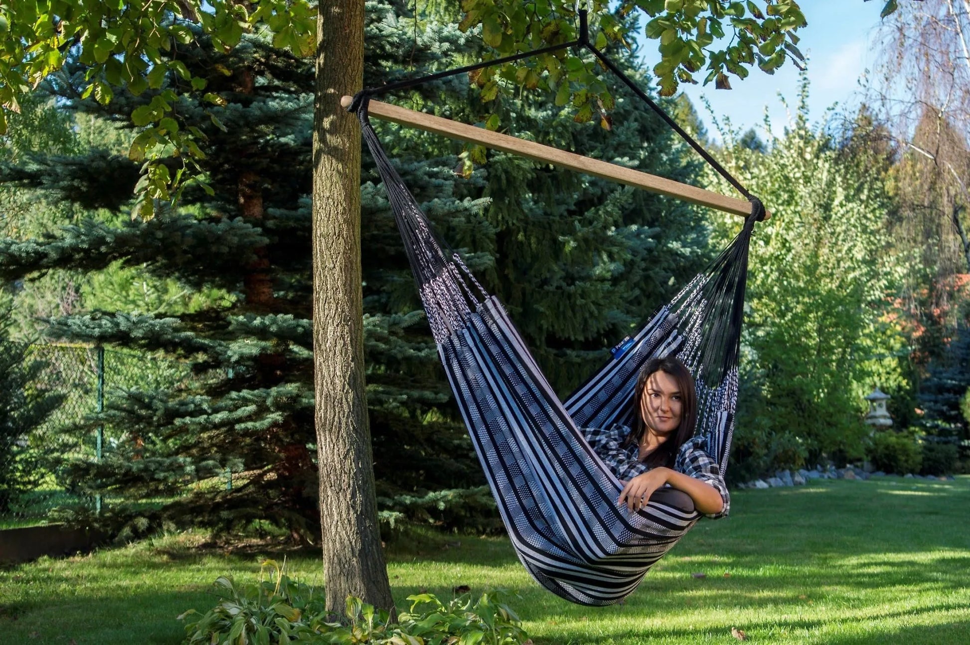 Plus besoin de chercher deux arbres. Grâce à son support en acier thermolaqué, le fauteuil est ultra stable, même pour deux personnes (jusqu’à 160kg).