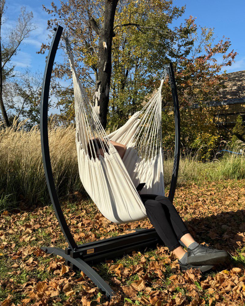 Plus besoin de chercher deux arbres. Grâce à son support en acier thermolaqué, le fauteuil est ultra stable, même pour deux personnes (jusqu’à 160kg).