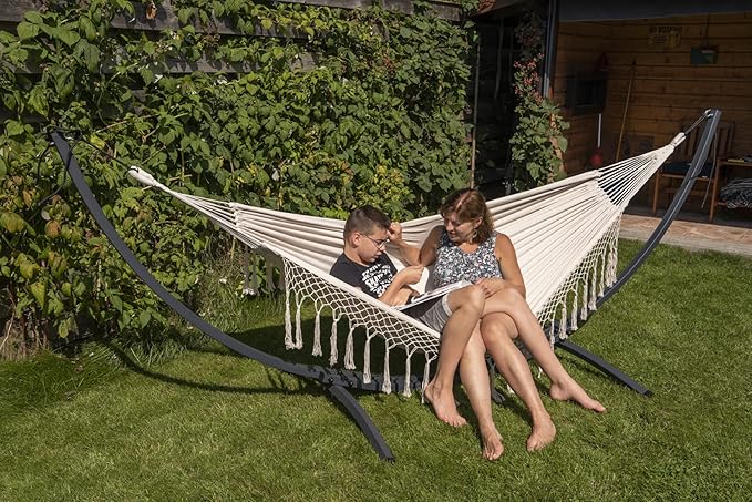 Plus besoin de chercher deux arbres. Grâce à son support en acier thermolaqué, le hamac est ultra stable, même pour deux personnes (jusqu’à 220 kg).