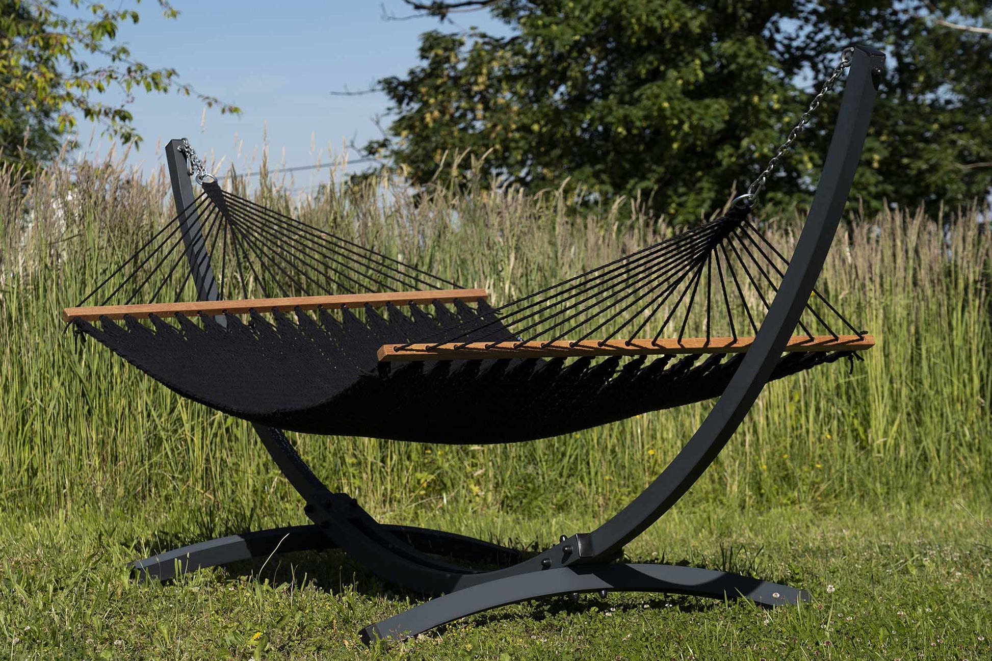 Plus besoin de chercher deux arbres. Grâce à son support en acier thermolaqué compact et robuste, le hamac reste parfaitement stable, même en extérieur, et peut supporter jusqu’à 220 kg.